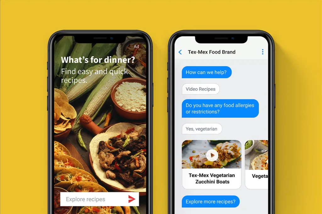Picture someone surfing on their mobile device for recipe inspiration. A chat option appears with a leading Tex-Mex brand asking how they can help. The person types in “video” and instructional video recipes appear on the screen.