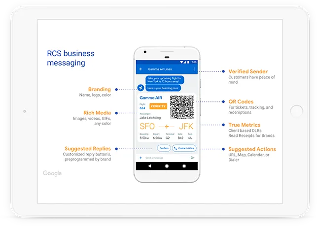 The upgrade from SMS/MMS to RCS messaging service is not a slight one and that makes this even more compelling. You have the most used channel by volume globally upgrading from command line text to a rich text messaging service interface in the year 2019 and beyond. Here are some of the features you will see with RCS: the verified sender giving improved customer peace of mind; branding with name, logo and color; rich media messaging with images, videos, and GIFS; true metrics supplying read receipts and other advanced analytics ; QR codes for tickets, tracking, and redemptions; suggested replies giving customized reply buttons; suggested actions with URL, map, calendar, or dialer functionality (GSMA).