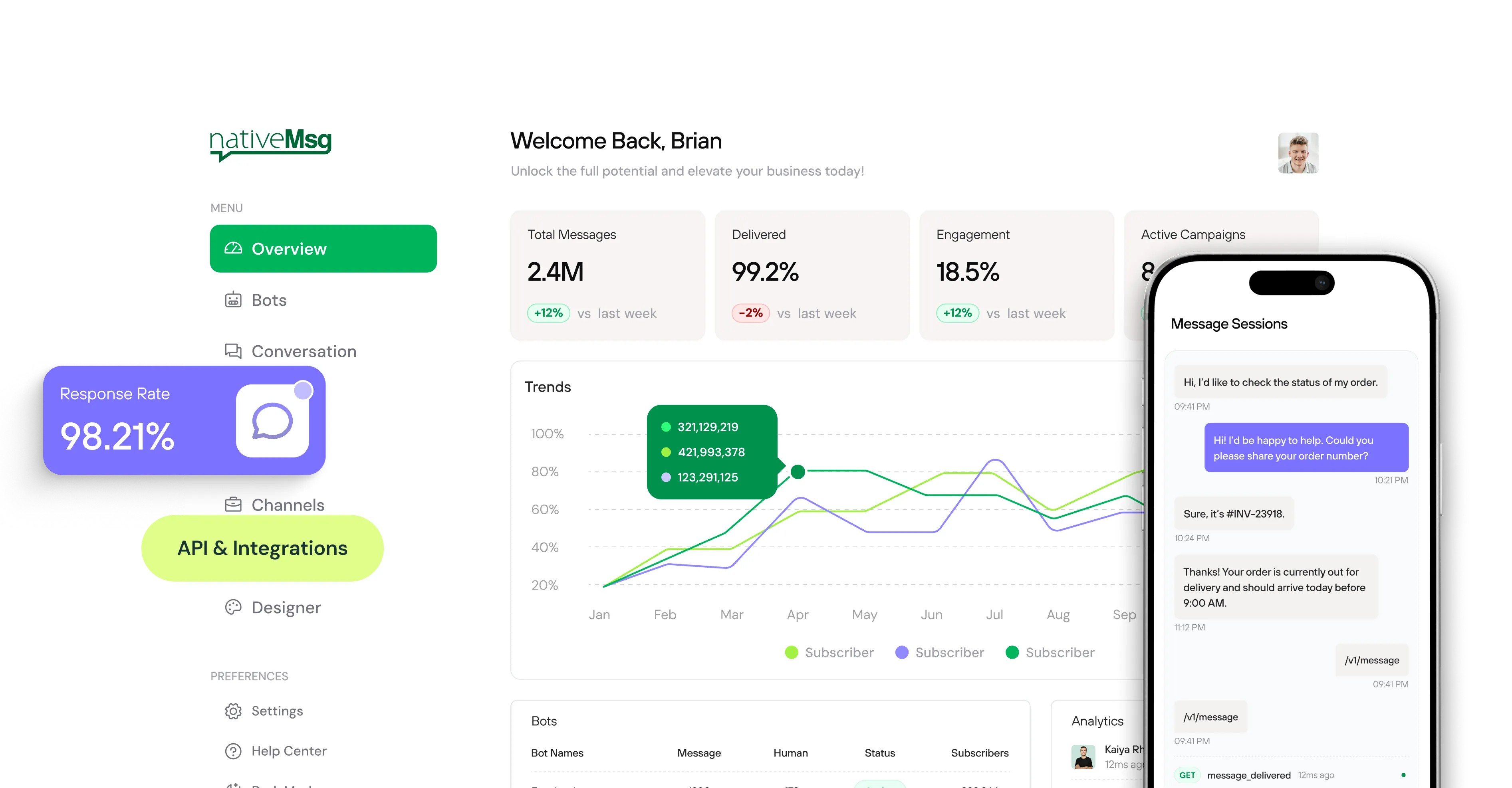 RESTful API for uploading campaigns from Creator or custom systems. Programmatic control over message sending, session management, and analytics retrieval. Webhook support for real-time event notifications.