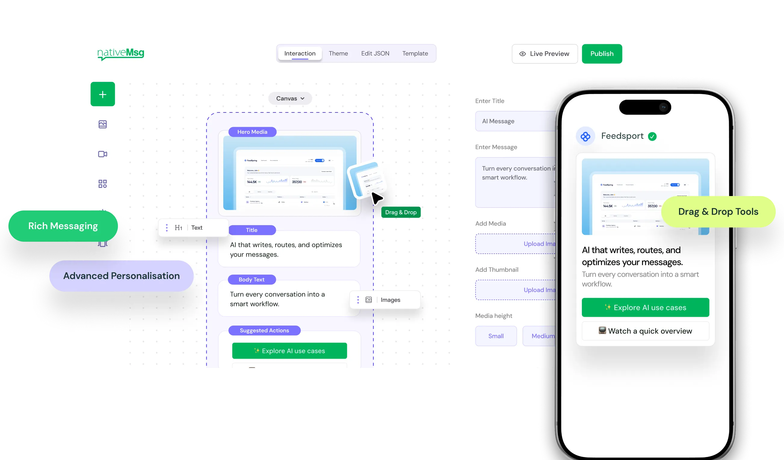 Drag and drop your way to interactive campaigns with rich media, carousels, buttons, and conversational flows.