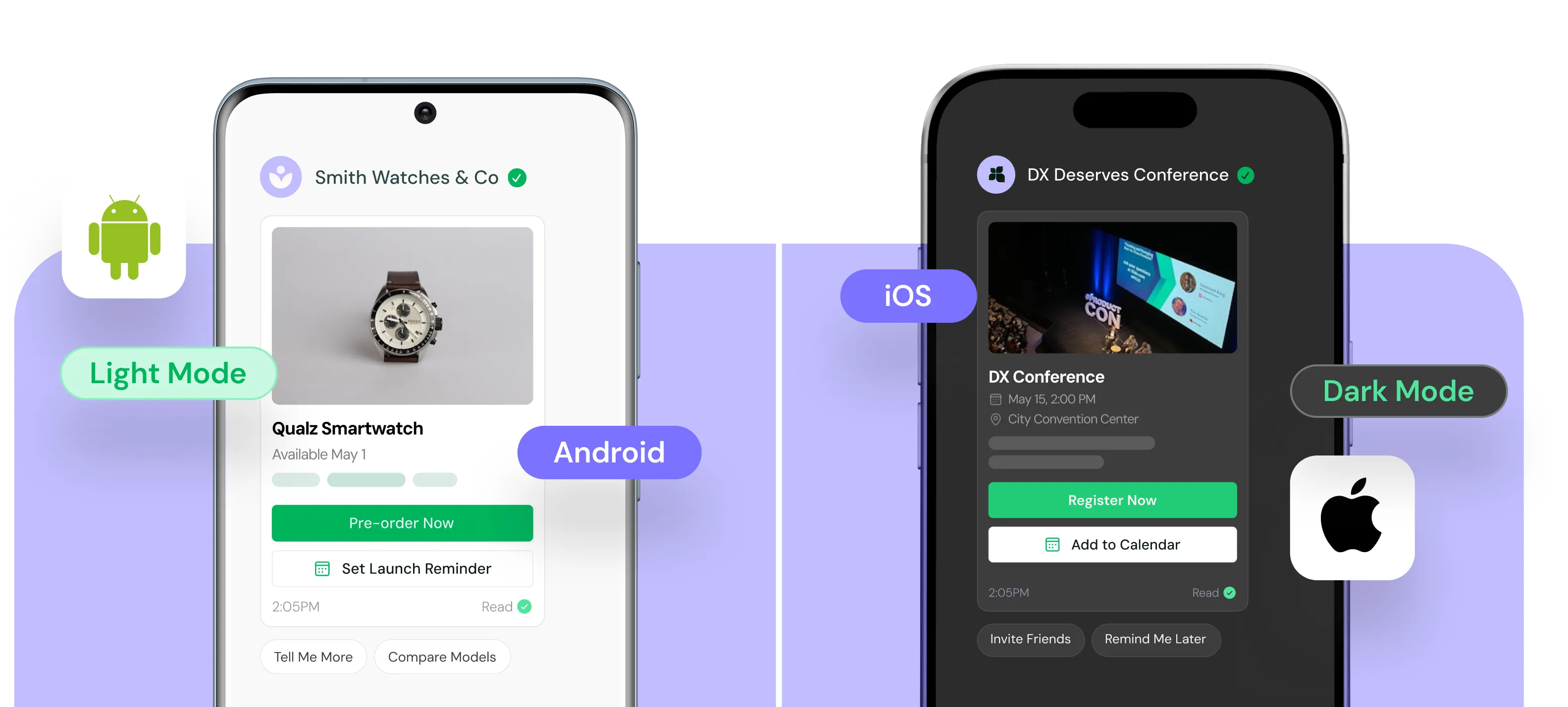 Real-time preview on Android and iOS. Test interactions. Toggle light/dark mode. Verify fallback appearance for non-RCS devices.