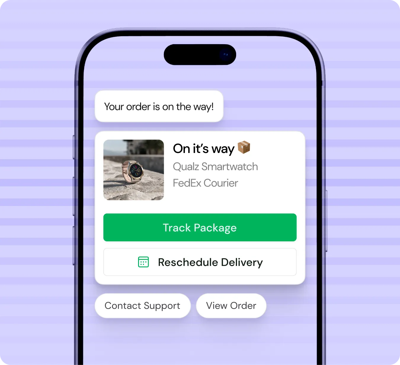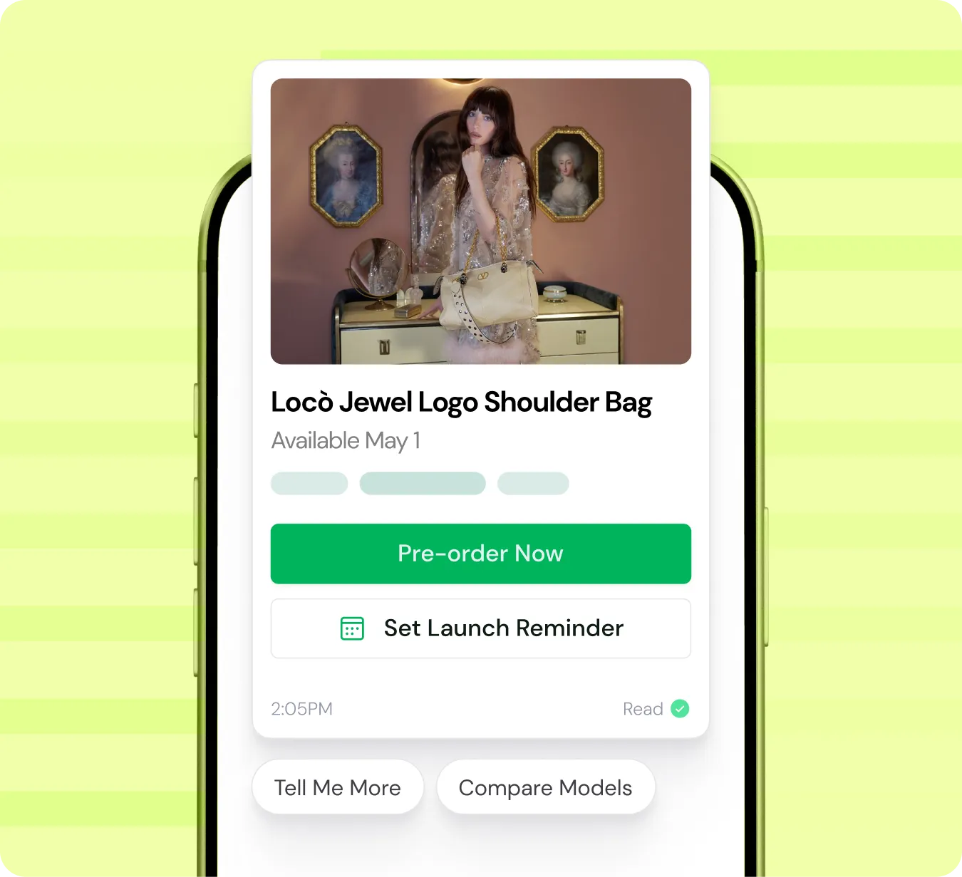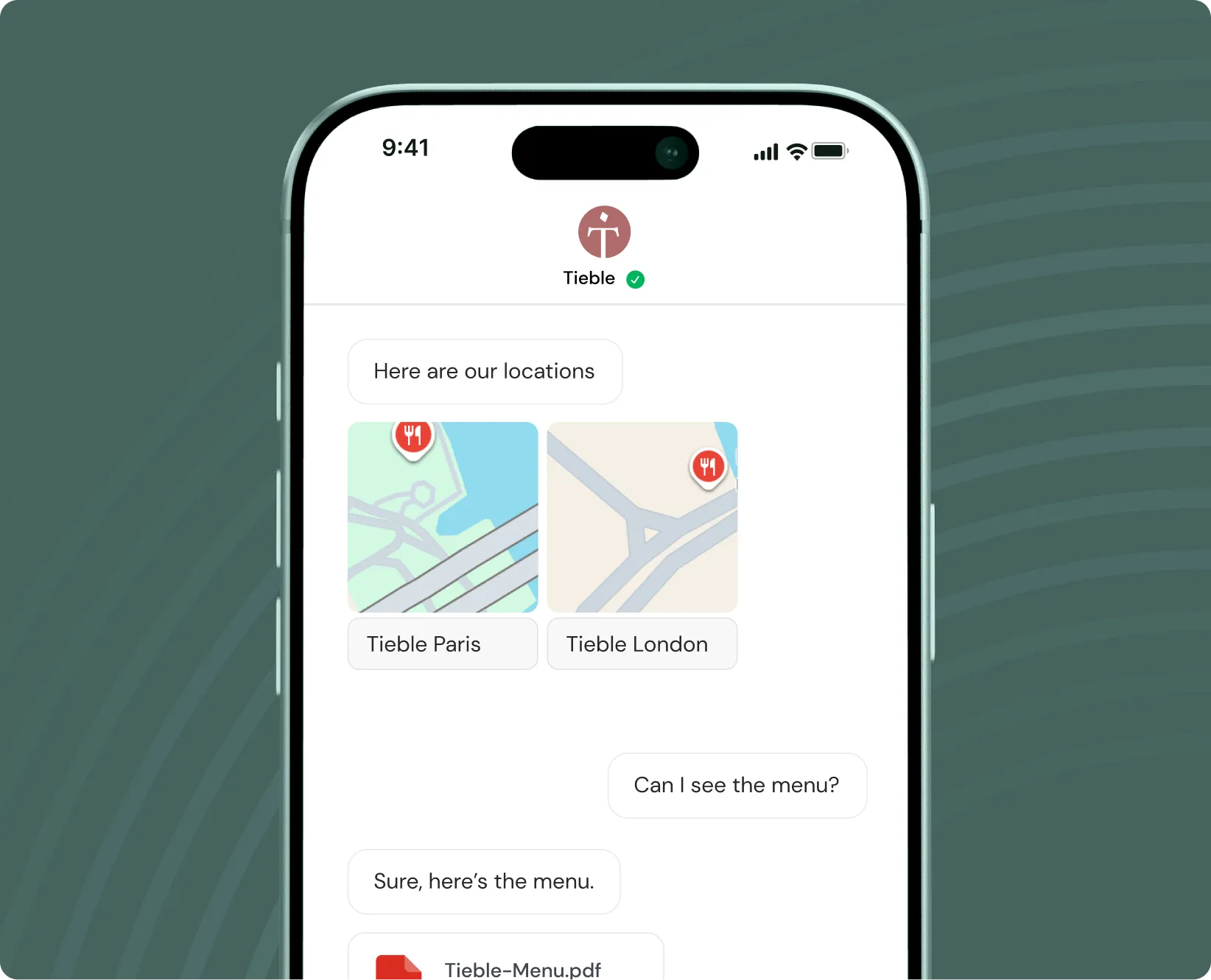 Send product galleries customers can swipe through like Instagram. Tap an image, it goes full-screen. Tap a button, they buy it. Up to 10 products in one message.