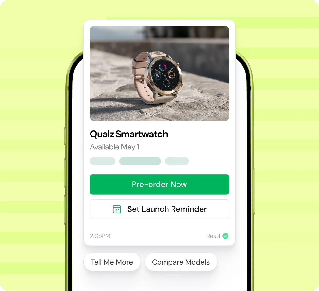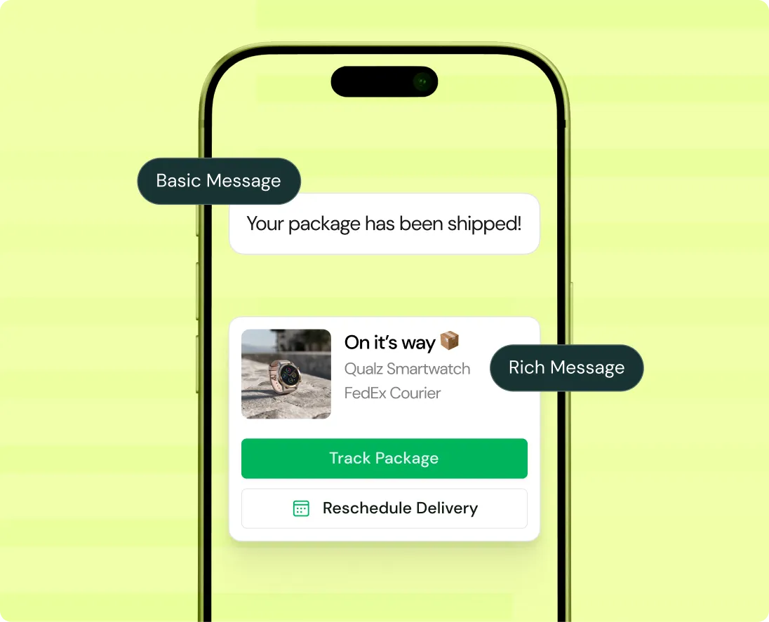 Send branded experiences customers engage with rich media, interactive buttons, verified sender identity; all delivered where they already spend their time: the messaging inbox.