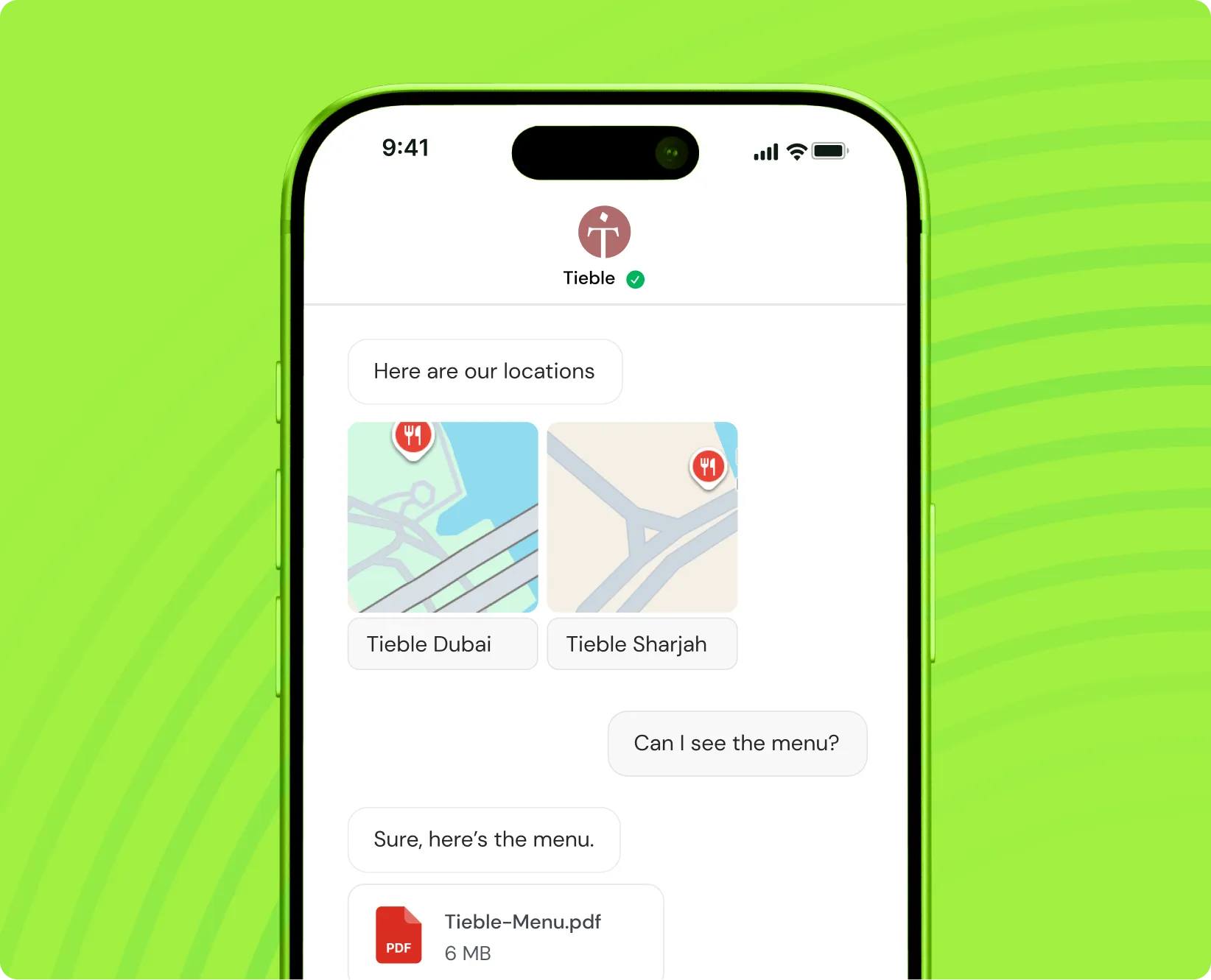 Send product galleries customers can swipe through like Instagram. Tap an image, it goes full-screen. Tap a button, they buy it. Up to 10 products in one message.
