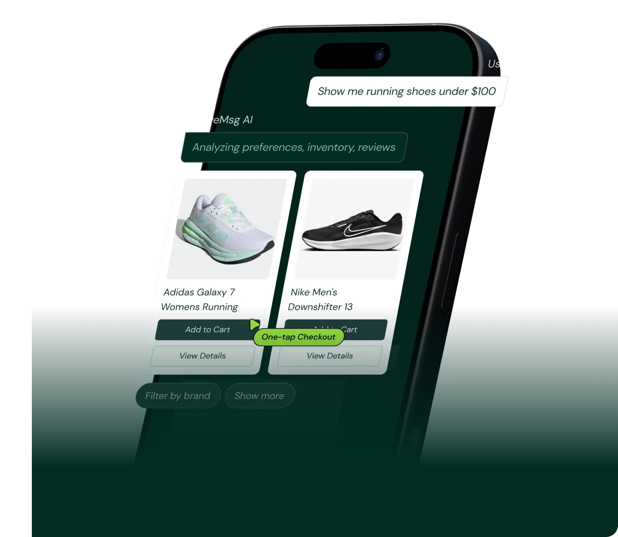 AI powers recommendations, then nativeMsg displays a unique, well crafted purchase journey with verified brand identity that drives trust and conversion.